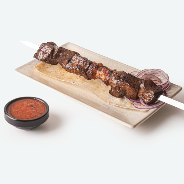 Кусочки печени с бараньим курдюком, подаём с красным томатным соусом. 90/20/10 гр.